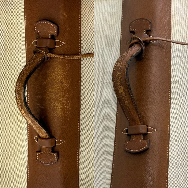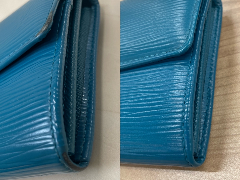 ハイブランド品の特徴に合わせた最適なカラーリングを行います。ステッチ部分もマスキングする丁寧な仕事で、立体的でより新品に近い染め上げを実現しています。