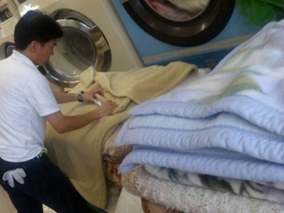 寝具到着後に専門知識を有したスタッフが検品作業をいたします。寝具の状態と汚れ具合などを1点1点丁寧に検品して工場に出荷します。