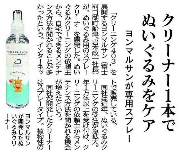 当社の「ぬいぐるみクリーナー」が山梨日日新聞に取り上げられました!プロ仕様のクリーニング技術を家庭でも手軽に体験できる商品として、開発背景や特長が詳しく紹介され、大変好評をいただいております。
