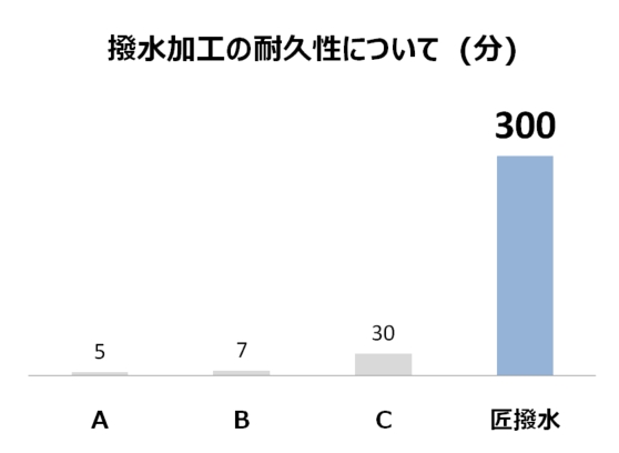 耐久性は一般撥水加工と比較して流水テストにて10倍の耐久性を有していることが実証されています。
